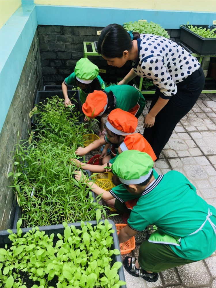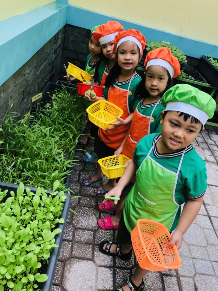 Các bé đã sẵn sàng thu hoạch rau trong vườn trường cùng bạn bè.