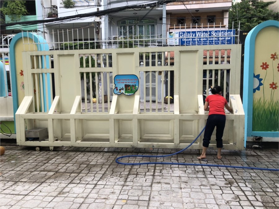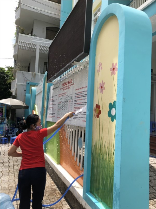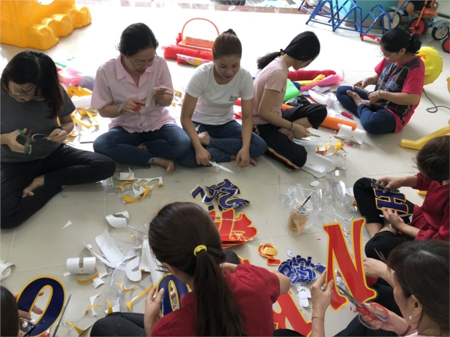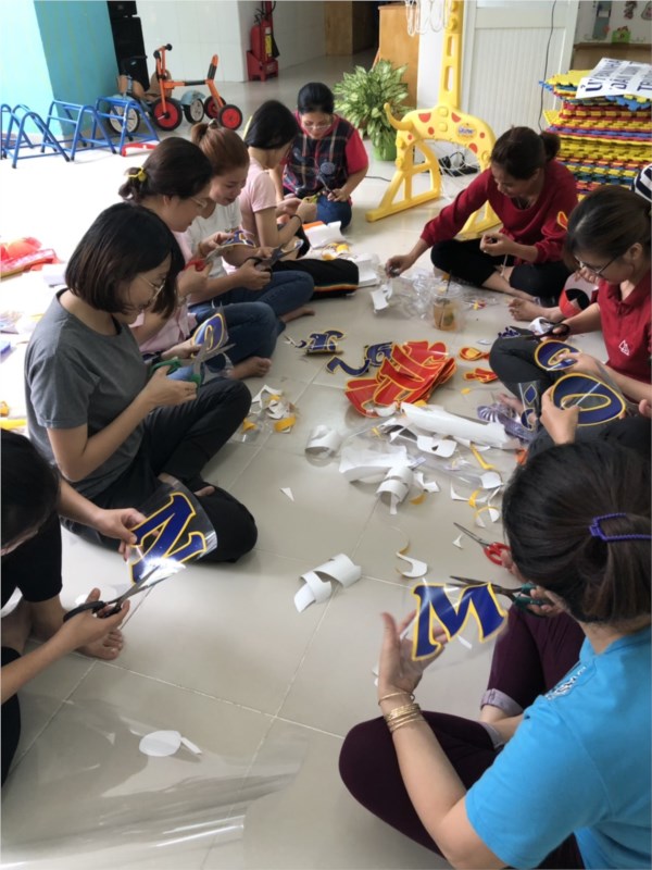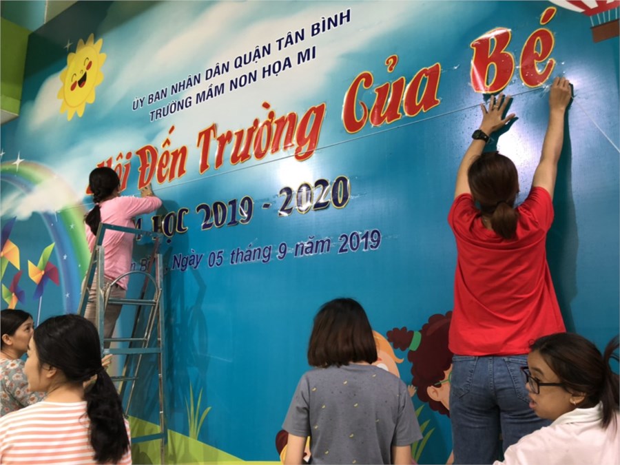 Giáo viên dán phông "Ngày hội đến trường của bé"