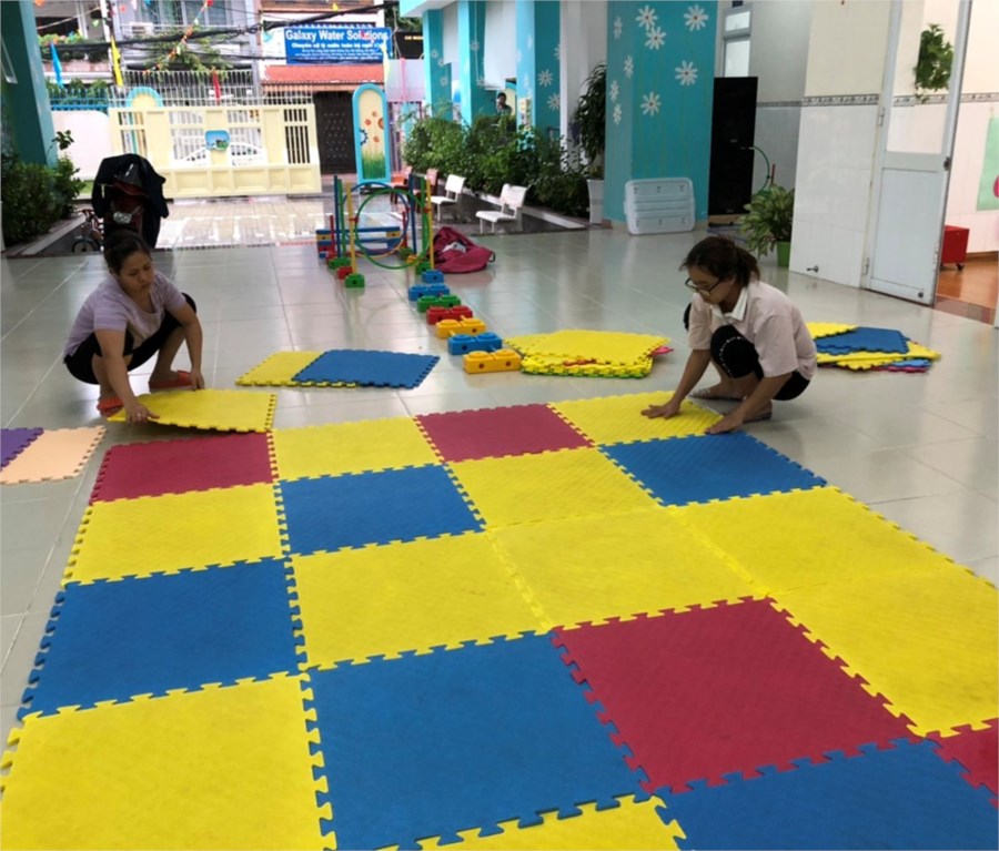 Giáo viên xếp thảm tiếp đất để chuẩn bị cho các góc chơi